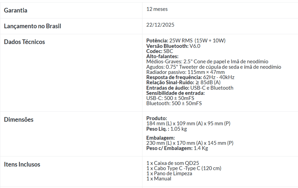 Com 25W RMS de potência, a QD25 entrega um som surpreendentemente robusto para seu tamanho compacto. O segredo está na combinação precisa de um driver de médio-grave de 2,5″, um tweeter de cúpula de seda de 0,75″ e um radiador passivo oval, todos com ímãs de neodímio e alimentados por um eficiente amplificador Classe D. O resultado é um áudio dinâmico, equilibrado e com graves impactantes, perfeito para música, filmes e até jogos